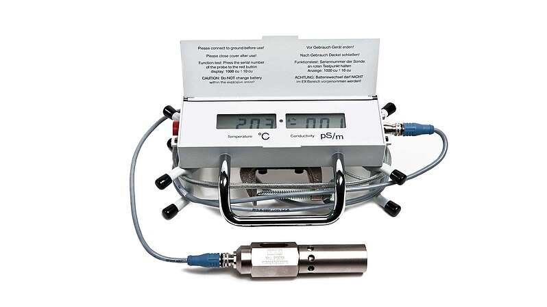 For mobile conductivity measurement, a portable measuring device equipped with a conductivity probe is used. The probe is immersed in the liquid to be measured. The measuring device generates a weak electric current between the electrodes of the probe. The liquid, which contains dissolved ions, conducts the current.