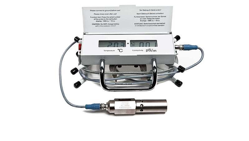 Measuring electrical conductivity is an important method in the quality control of solvent-based systems, as it provides information about the concentration of ions and the purity of the liquid. This is particularly important in industrial processes such as paint production. The probe body used for conductivity measurements consists of a core electrode and a sheathed electrode at its end. Depending on the device version, the sheath electrode is provided with inlet and outlet holes of different sizes so that the oil to be measured can quickly pass between the two electrodes. A precisely regulated DC voltage is applied to the electrodes. The fuel between the electrodes transports the electric current from one electrode to the other. A resistor is used for the basic calibration of the devices, as the conductivity value is physically the inverse of the resistance value.